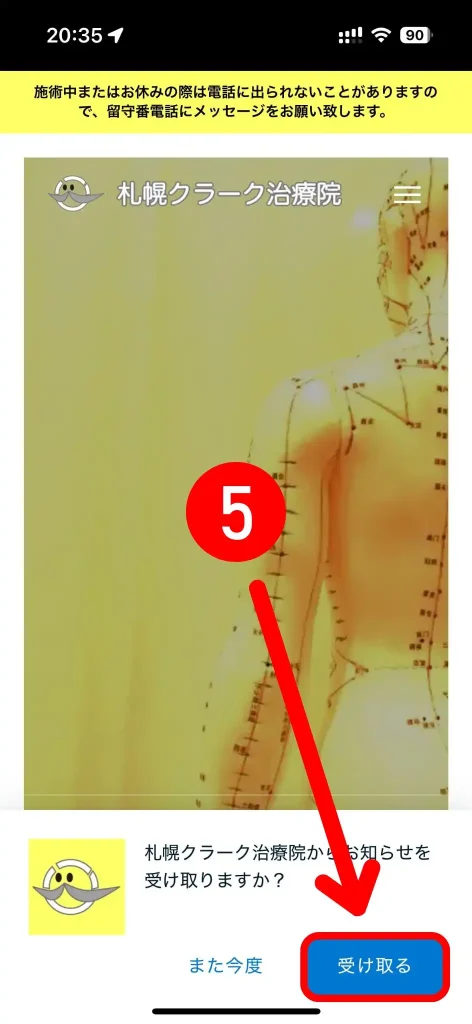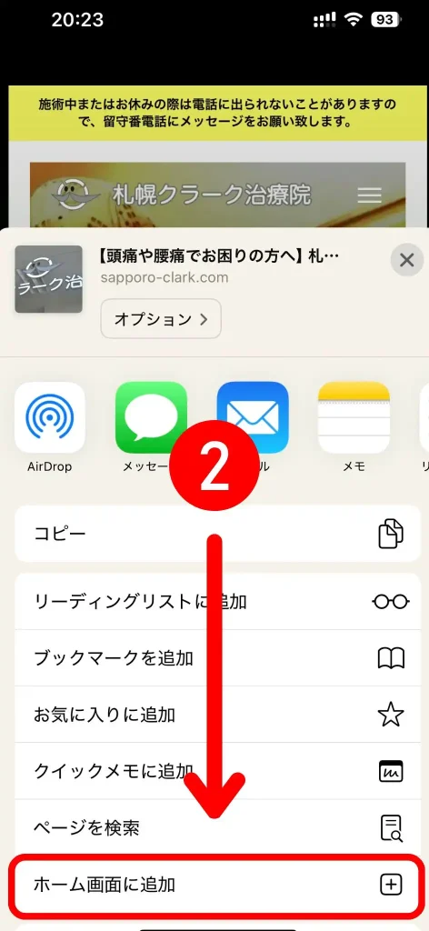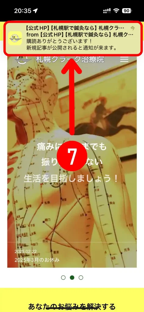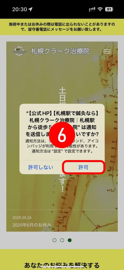 1 ブラウザ(Safari)のツールバーにある「共有アイコン」をタップ 2 展開されるメニューから「ホーム画面に追加」をタップ 3 名称を入力して「完了」をタップ 4 ホームに追加されたアイコンをタップ 5 下にスクロールするとお知らせが出てくるので「受け取る」をタップ 6 ポップアップの「許可」をタップ 7 通知が許可されて完了
